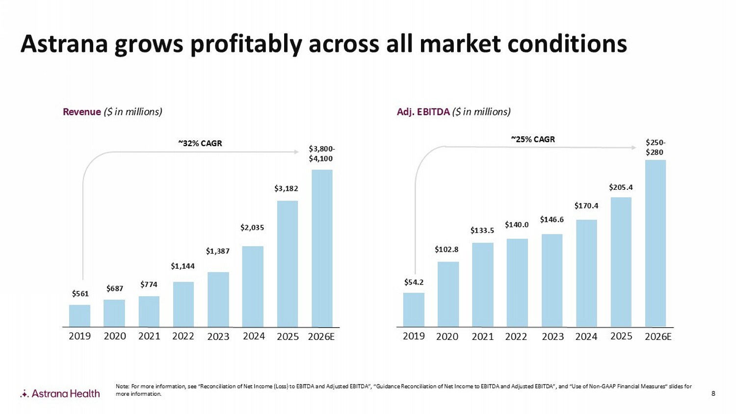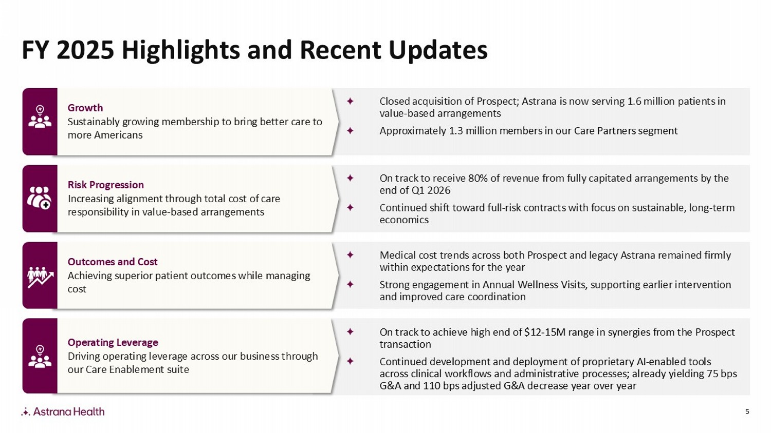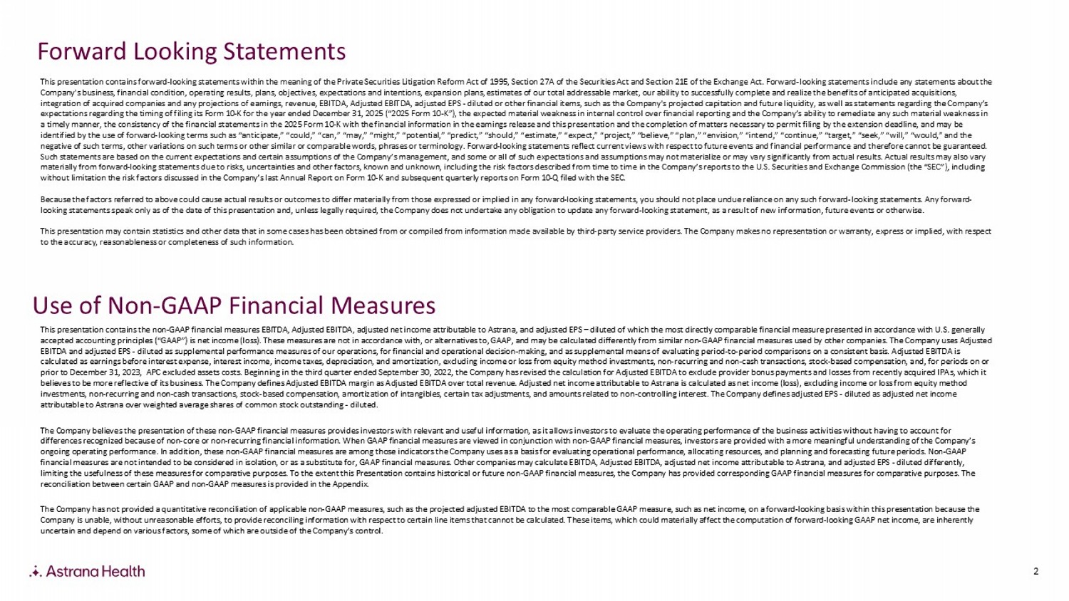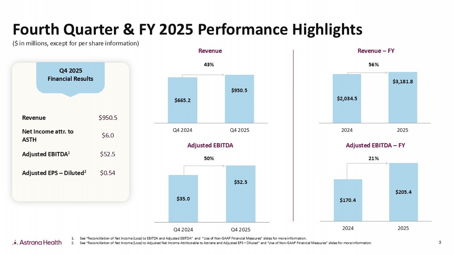 2 Forward Looking Statements This presentation contains forward - looking statements within the meaning of the Private Securities Litigation Reform Act of 1995 , Section 27A of the Securities Act and Section 21E of the Exchange Act. Forward - looking statements include any statements about the Company's business, financial condition, operating results, plans, objectives, expectations and intentions, expansion plans, est imates of our total addressable market, our ability to successfully complete and realize the benefits of anticipated acquisit ion s, integration of acquired companies and any projections of earnings, revenue, EBITDA, Adjusted EBITDA, adjusted EPS - diluted or o ther financial items, such as the Company's projected capitation and future liquidity, as well as statements regarding the Co mpa ny’s expectations regarding the timing of filing its Form 10 - K for the year ended December 31, 2025 (“2025 Form 10 - K”), the expected material weakness in internal control over financial reporting and the Company’s ability to remediate any such material weakn ess in a timely manner, the consistency of the financial statements in the 2025 Form 10 - K with the financial information in the earning s release and this presentation and the completion of matters necessary to permit filing by the extension deadline, and may b e identified by the use of forward - looking terms such as “anticipate,” “could,” “can,” “may,” “might,” “potential,” “predict,” “sh ould,” “estimate,” “expect,” “project,” “believe,” “plan,” “envision,” “intend,” “continue,” “target,” “seek,” “will,” “would ,” and the negative of such terms, other variations on such terms or other similar or comparable words, phrases or terminology. Forward - loo king statements reflect current views with respect to future events and financial performance and therefore cannot be guarant eed . Such statements are based on the current expectations and certain assumptions of the Company’s management, and some or all of su ch expectations and assumptions may not materialize or may vary significantly from actual results. Actual results may also va ry materially from forward - looking statements due to risks, uncertainties and other factors, known and unknown, including the risk factors described from time to time in the Company’s reports to the U.S. Securities and Exchange Commission (the “SEC”), incl udi ng without limitation the risk factors discussed in the Company’s last Annual Report on Form 10 - K and subsequent quarterly reports on Form 10 - Q filed with the SEC. Because the factors referred to above could cause actual results or outcomes to differ materially from those expressed or imp lie d in any forward - looking statements, you should not place undue reliance on any such forward - looking statements. Any forward - looking statements speak only as of the date of this presentation and, unless legally required, the Company does not undertak e a ny obligation to update any forward - looking statement, as a result of new information, future events or otherwise. This presentation may contain statistics and other data that in some cases has been obtained from or compiled from informatio n m ade available by third - party service providers. The Company makes no representation or warranty, express or implied, with respec t to the accuracy, reasonableness or completeness of such information. Use of Non - GAAP Financial Measures This presentation contains the non - GAAP financial measures EBITDA, Adjusted EBITDA, adjusted net income attributable to Astrana, and adjusted EPS – diluted of which the most directly comparable financial measure presented in accordance with U.S. generally accepted accounting principles (“GAAP”) is net income (loss). These measures are not in accordance with, or alternatives to, GAA P, and may be calculated differently from similar non - GAAP financial measures used by other companies. The Company uses Adjusted EBITDA and adjusted EPS - diluted as supplemental performance measures of our operations, for financial and operational decision - making, and as supplemental means of evaluating period - to - period comparisons on a consistent basis. Adjusted EBITDA is calculated as earnings before interest expense, interest income, income taxes, depreciation, and amortization, excluding inco me or loss from equity method investments, non - recurring and non - cash transactions, stock - based compensation, and, for periods on o r prior to December 31, 2023, APC excluded assets costs. Beginning in the third quarter ended September 30, 2022, the Company has revised the calculation for Adjusted EBITDA to exclude provider bonus payments and losses from recently acquired IPAs, which it believes to be more reflective of its business. The Company defines Adjusted EBITDA margin as Adjusted EBITDA over total reve nue . Adjusted net income attributable to Astrana is calculated as net income (loss), excluding income or loss from equity method investments, non - recurring and non - cash transactions, stock - based compensation, amortization of intangibles, certain tax adjustm ents, and amounts related to non - controlling interest. The Company defines adjusted EPS - diluted as adjusted net income attributable to Astrana over weighted average shares of common stock outstanding - diluted. The Company believes the presentation of these non - GAAP financial measures provides investors with relevant and useful informati on, as it allows investors to evaluate the operating performance of the business activities without having to account for differences recognized because of non - core or non - recurring financial information. When GAAP financial measures are viewed in co njunction with non - GAAP financial measures, investors are provided with a more meaningful understanding of the Company’s ongoing operating performance. In addition, th