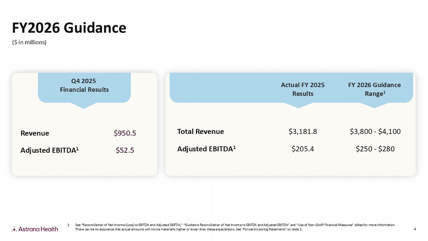 3 $170.4 $205.4 2024 2025 $35.0 $52.5 Q4 2024 Q4 2025 $2,034.5 $3,181.8 2024 2025 $665.2 $950.5 Q4 2024 Q4 2025 Q4 2025 Financial Results $950.5 Revenue $6.0 Net Income attr . to ASTH $52.5 Adjusted EBITDA 1 $0.54 Adjusted EPS – Diluted 2 1. See “Reconciliation of Net Income (Loss) to EBITDA and Adjusted EBITDA” and “Use of Non - GAAP Financial Measures” slides for mo re information. 2. See “Reconciliation of Net Income (Loss) to Adjusted Net Income Attributable to Astrana and Adjusted EPS – Diluted” and “Use of Non - GAAP Financial Measures” slides for more information. Revenue Adjusted EBITDA 43 % 50% Adjusted EBITDA – FY 21 % Revenue – FY 56 % Fourth Quarter & FY 2025 Performance Highlights ($ in millions, except for per share information)AS12