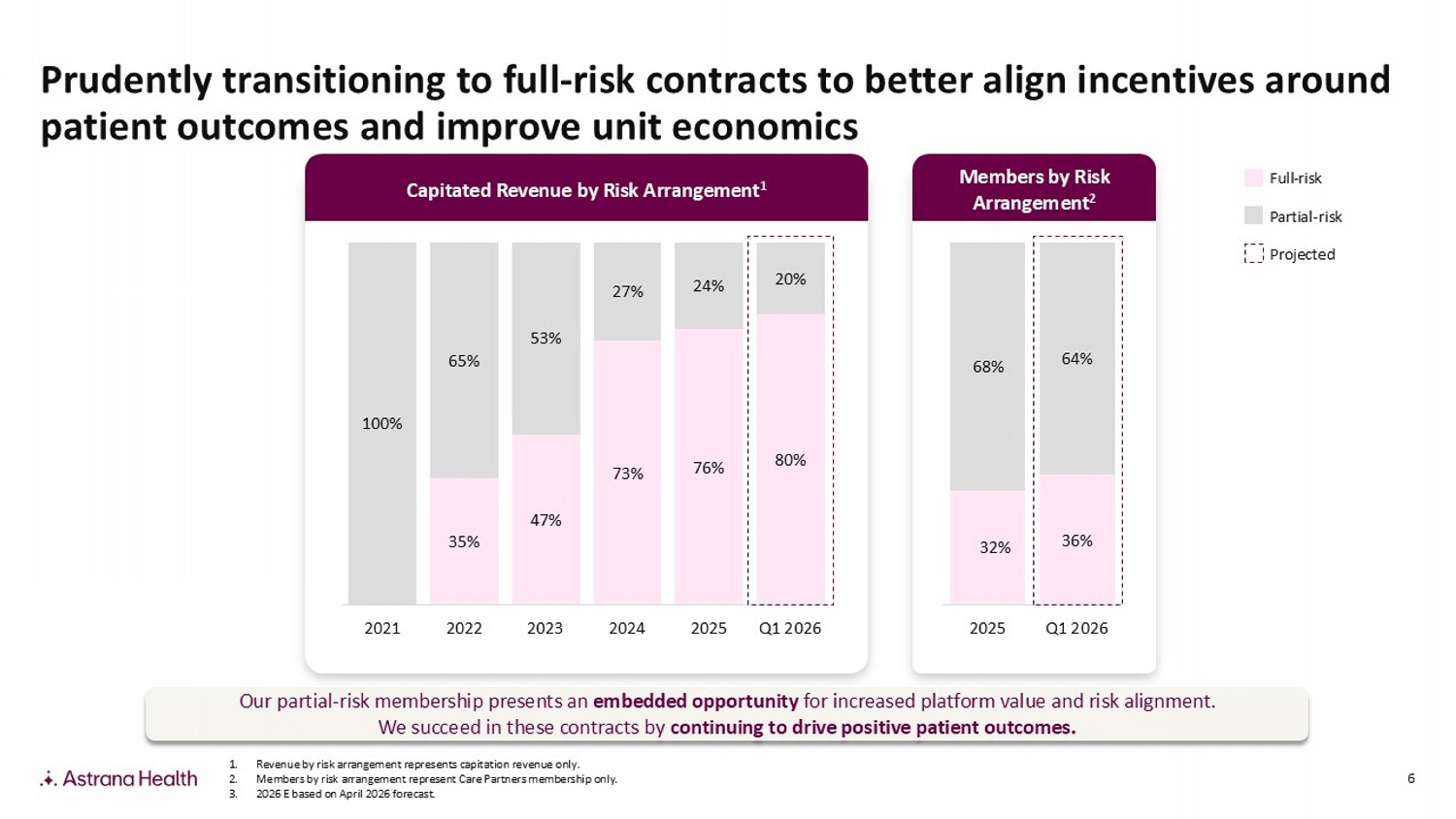 5 Growth Sustainably growing membership to bring better care to more Americans Closed acquisition of Prospect; Astrana is now serving 1.6 million patients in value - based arrangements Approximately 1.3 million m embers in our Care Partners segment Growth FY 2025 Highlights and Recent Updates Operating Leverage Driving operating leverage across our business through our Care Enablement suite On track to achieve high end of $12 - 15M range in synergies from the Prospect transaction Continued development and deployment of proprietary AI - enabled tools across clinical workflows and administrative processes; already yielding 75 bps G&A and 110 bps adjusted G&A decrease year over year Risk Progression Increasing alignment through total cost of care responsibility in value - based arrangements On track to receive 80% of revenue from fully capitated arrangements by the end of Q1 2026 Continued shift toward full - risk contracts with focus on sustainable, long - term economics Outcomes and Cost Achieving superior patient outcomes while managing cost Medical cost trends across both Prospect and legacy Astrana remained firmly within expectations for the year Strong engagement in Annual Wellness Visits, supporting earlier intervention and improved care coordination