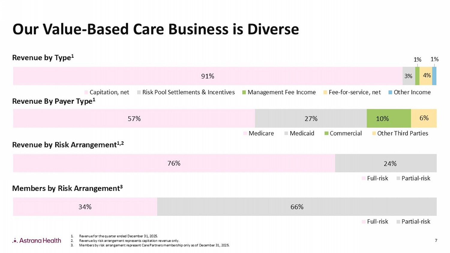 6 Projected Full - risk P artial - risk Members by Risk Arrangement 2 35% 47% 73% 76% 80% 100% 65% 53% 27% 24% 20% 2021 2022 2023 2024 2025 Q1 2026 32% 36% 68% 64% 2025 Q1 2026 Capitated Revenue by Risk Arrangement 1 Our partial - risk membership presents an embedded opportunity for increased platform value and risk alignment. We succeed in these contracts by continuing to drive positive patient outcomes. 1. Revenue by risk arrangement represents capitation revenue only. 2. Members by risk arrangement represent Care Partners membership only. 3. 2026 E based on April 2026 forecast. Prudently transitioning to full - risk contracts to better align incentives around patient outcomes and improve unit economicsAS1