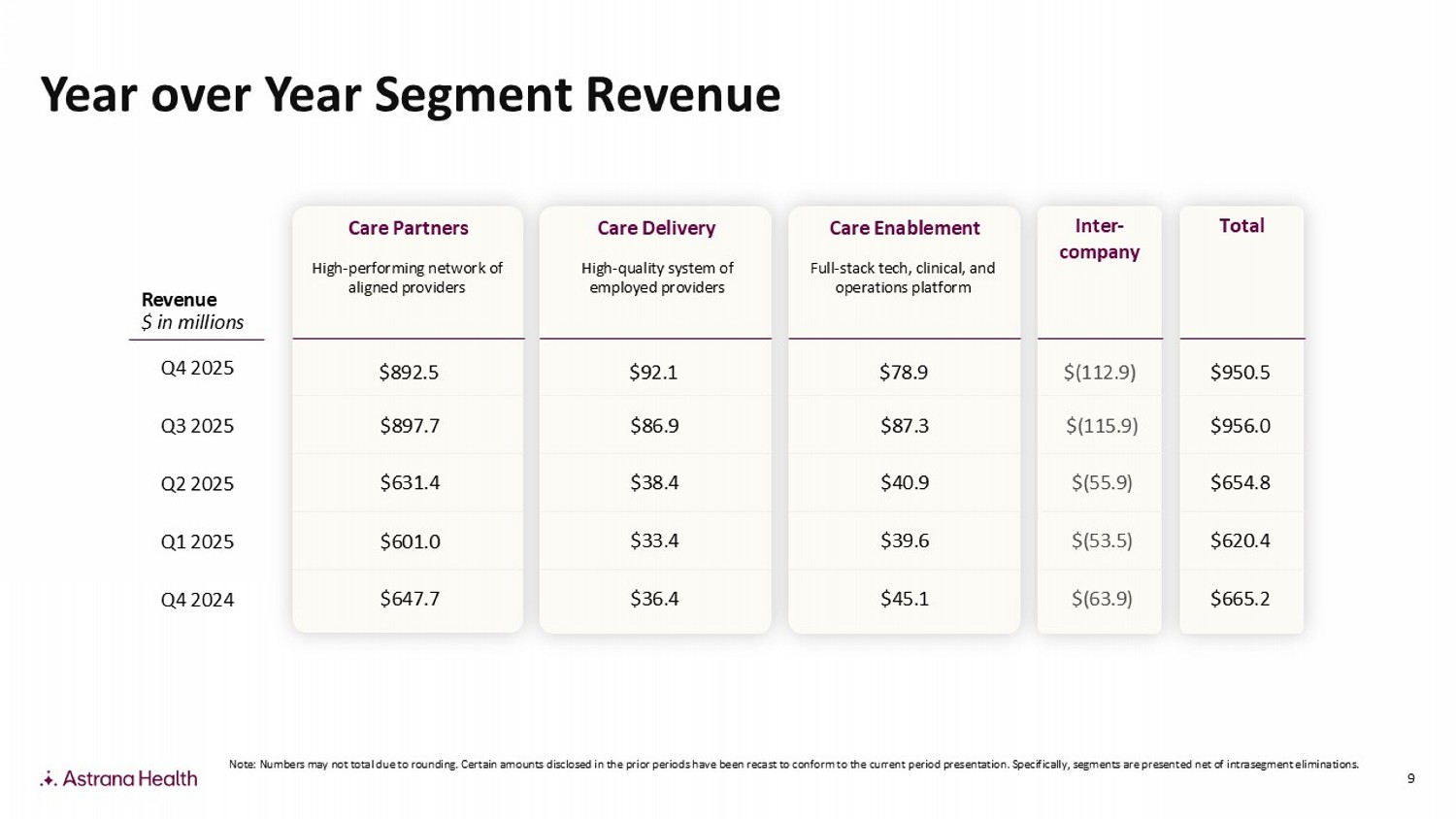 8 Revenue ($ in millions) Adj. EBITDA ($ in millions) $561 $687 $774 $1,144 $1,387 $2,035 $3,182 2019 2020 2021 2022 2023 ~32 % CAGR 2024 $54.2 $102.8 $133.5 $140.0 $146.6 $170.4 $205.4 2019 2020 2021 2022 2023 2024 ~25 % CAGR 2025 $3,800 - $4,100 $250 - $280 2026E 2026E 2025 Astrana grows profitably across all market conditions Note: For more information, see “Reconciliation of Net Income (Loss) to EBITDA and Adjusted EBITDA”, “Guidance Reconciliation of Net Income to EBITDA and Adjusted EBITDA”, and “Use of Non - GAAP Financial Measures“ slides for more information.AS1