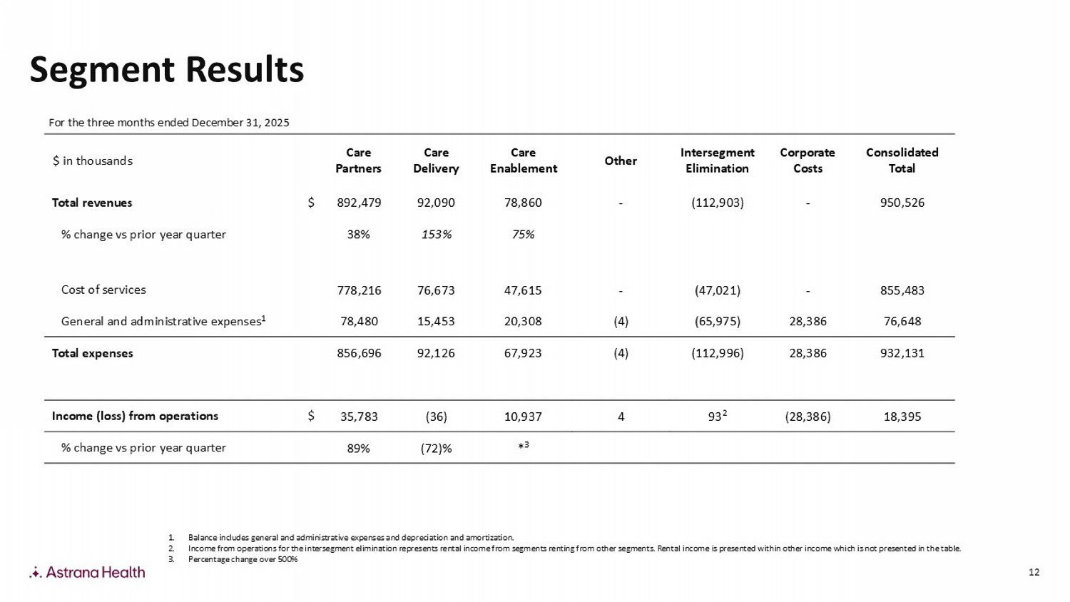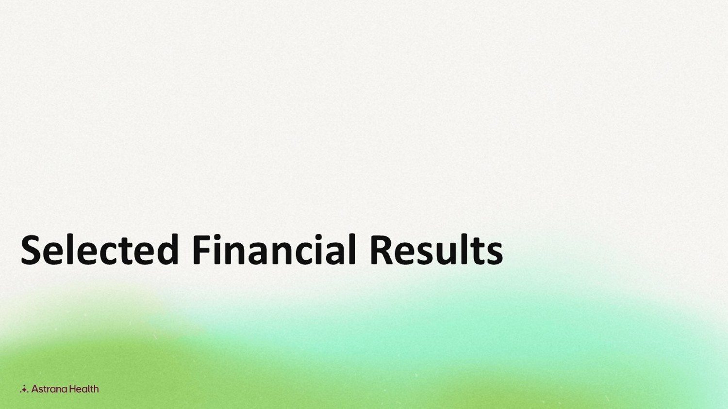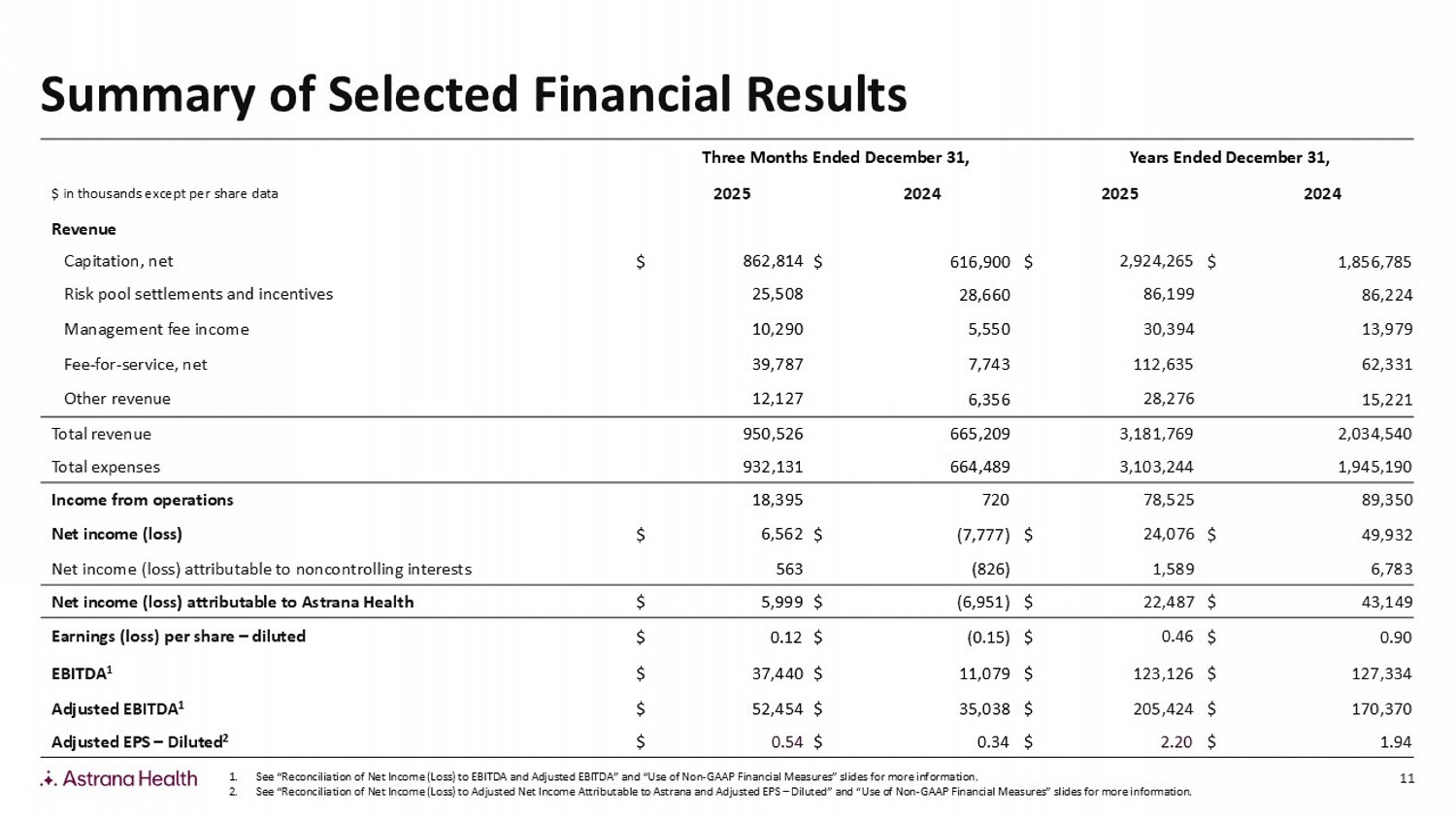 11 Years Ended December 31, Three Months Ended December 31, 2024 2025 2024 2025 $ in thousands except per share data Revenue 1,856,785 $ 2,924,265 $ 616,900 $ 862,814 $ Capitation, net 86,224 86,199 28,660 25,508 Risk pool settlements and incentives 13,979 30,394 5,550 10,290 Management fee income 62,331 112,635 7,743 39,787 Fee - for - service, net 15,221 28,276 6,356 12,127 Other revenue 2,034,540 3,181,769 665,209 950,526 Total revenue 1,945,190 3,103,244 664,489 932,131 Total expenses 89,350 78,525 720 18,395 Income from operations 49,932 $ 24,076 $ (7,777) $ 6,562 $ Net income (loss) 6,783 1,589 (826) 563 Net income (loss) attributable to noncontrolling interests 43,149 $ 22,487 $ (6,951) $ 5,999 $ Net income (loss) attributable to Astrana Health 0.90 $ 0.46 $ (0.15) $ 0.12 $ Earnings (loss) per share – diluted 127,334 $ 123,126 $ 11,079 $ 37,440 $ EBITDA 1 170,370 $ 205,424 $ 35,038 $ 52,454 $ Adjusted EBITDA 1 1.94 $ 2.20 $ 0.34 $ 0.54 $ Adjusted EPS – Diluted 2 Summary of Selected Financial Results 1. See “Reconciliation of Net Income (Loss) to EBITDA and Adjusted EBITDA” and “Use of Non - GAAP Financial Measures” slides for more information. 2. See “Reconciliation of Net Income (Loss) to Adjusted Net Income Attributable to Astrana and Adjusted EPS – Diluted” and “Use of Non - GAAP Financial Measures” slides for more information. KP1 KP2