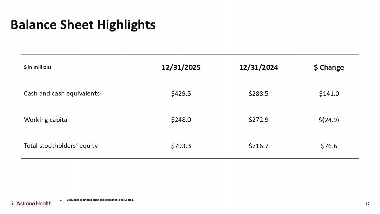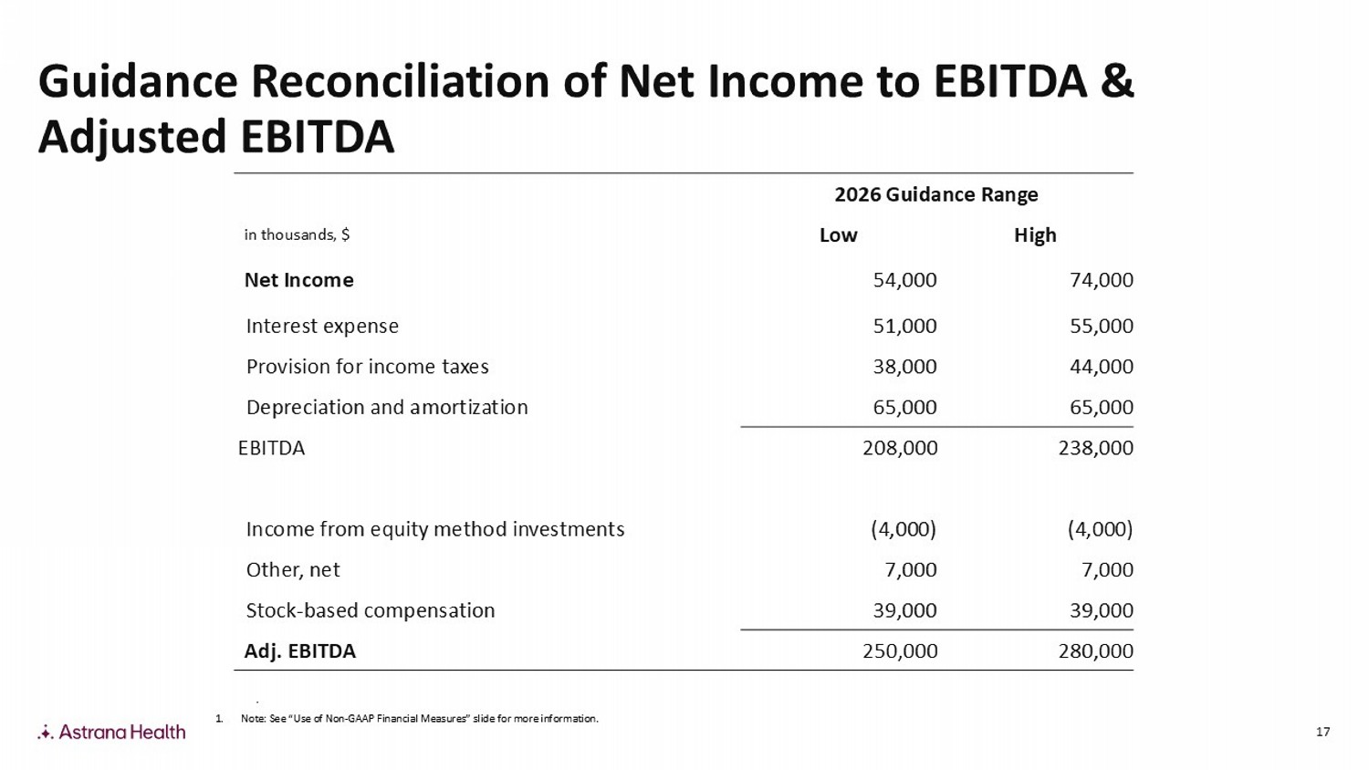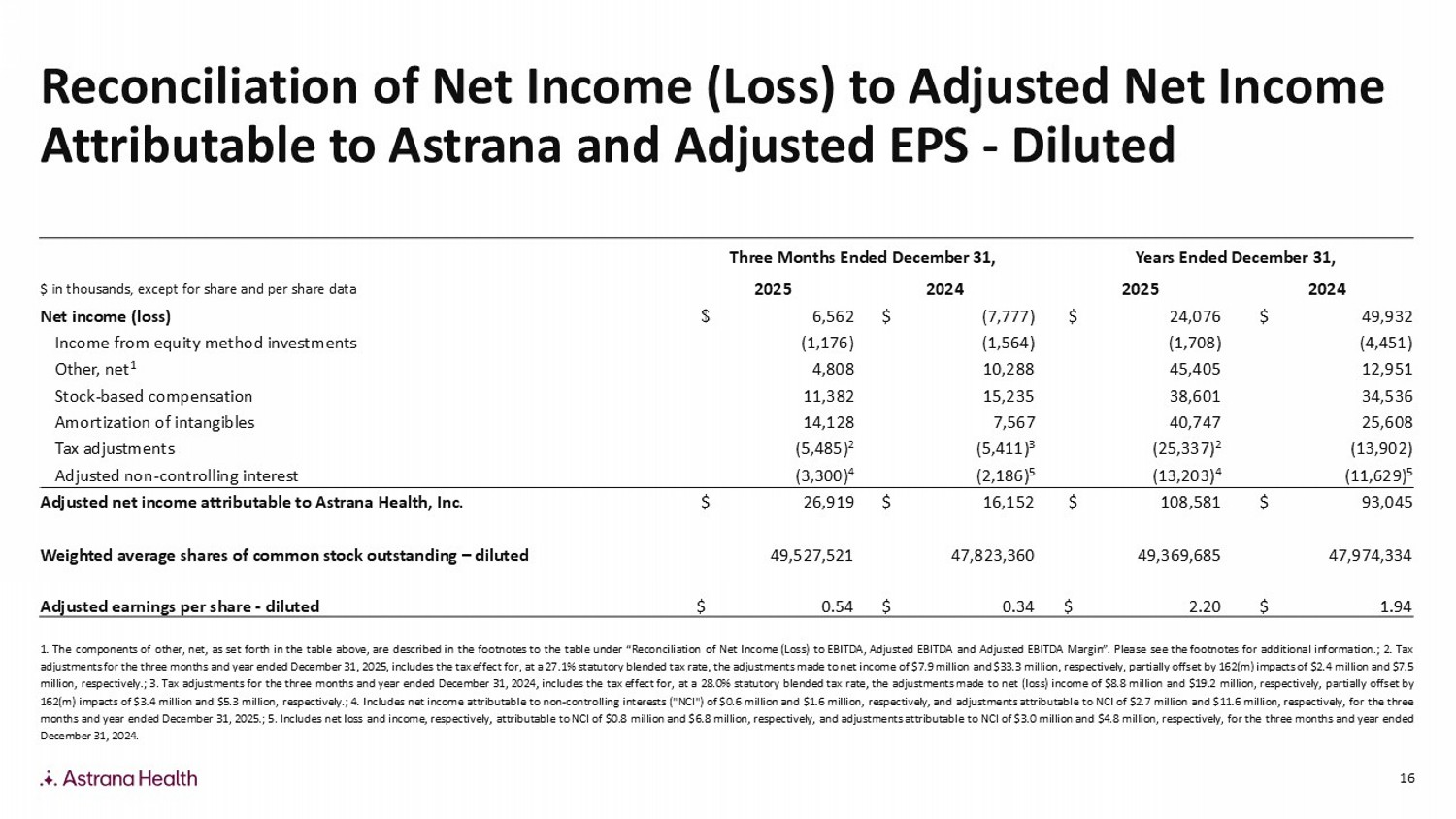16 Reconciliation of Net Income (Loss) to Adjusted Net Income Attributable to Astrana and Adjusted EPS - Diluted Years Ended December 31, Three Months Ended December 31, 2024 2025 2024 2025 $ in thousands, except for share and per share data 49,932 $ 24,076 $ (7,777) $ 6,562 $ Net income (loss) (4,451) (1,708) (1,564) (1,176) Income from equity method investments 12,951 45,405 10,288 4,808 Other, net 1 34,536 38,601 15,235 11,382 Stock - based compensation 25,608 40,747 7,567 14,128 Amortization of intangibles (13,902) (25,337) 2 (5,411) 3 (5,485) 2 Tax adjustments (11,629) 5 (13,203) 4 (2,186) 5 (3,300) 4 Adjusted non - controlling interest 93,045 $ 108,581 $ 16,152 $ 26,919 $ Adjusted net income attributable to Astrana Health, Inc. 47,974,334 49,369,685 47,823,360 49,527,521 Weighted average shares of common stock outstanding – diluted 1.94 $ 2.20 $ 0.34 $ 0.54 $ Adjusted earnings per share - diluted 1 . The components of other, net, as set forth in the table above, are described in the footnotes to the table under “Reconciliation of Net Income (Loss) to EBITDA, Adjusted EBITDA and Adjusted EBITDA Margin” . Please see the footnotes for additional information .; 2 . Tax adjustments for the three months and year ended December 31 , 2025 , includes the tax effect for, at a 27 . 1 % statutory blended tax rate, the adjustments made to net income of $ 7 . 9 million and $ 33 . 3 million, respectively, partially offset by 162 (m) impacts of $ 2 . 4 million and $ 7 . 5 million, respectively .; 3 . Tax adjustments for the three months and year ended December 31 , 2024 , includes the tax effect for, at a 28 . 0 % statutory blended tax rate, the adjustments made to net (loss) income of $ 8 . 8 million and $ 19 . 2 million, respectively, partially offset by 162 (m) impacts of $ 3 . 4 million and $ 5 . 3 million, respectively .; 4 . Includes net income attributable to non - controlling interests ("NCI") of $ 0 . 6 million and $ 1 . 6 million, respectively, and adjustments attributable to NCI of $ 2 . 7 million and $ 11 . 6 million, respectively, for the three months and year ended December 31 , 2025 .; 5 . Includes net loss and income, respectively, attributable to NCI of $ 0 . 8 million and $ 6 . 8 million, respectively, and adjustments attributable to NCI of $ 3 . 0 million and $ 4 . 8 million, respectively, for the three months and year ended December 31 , 2024 . AS1