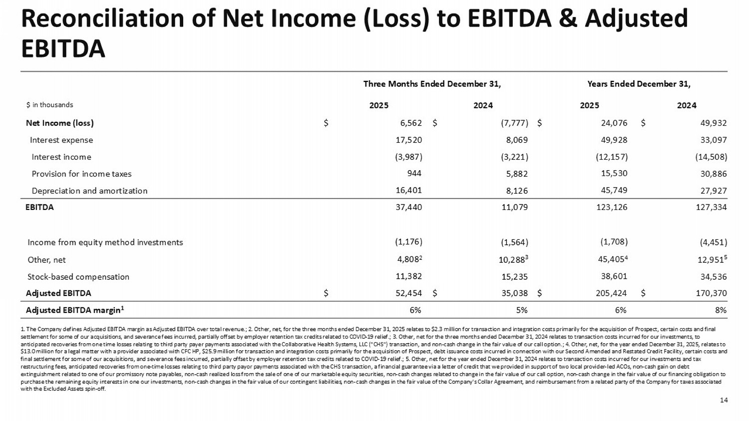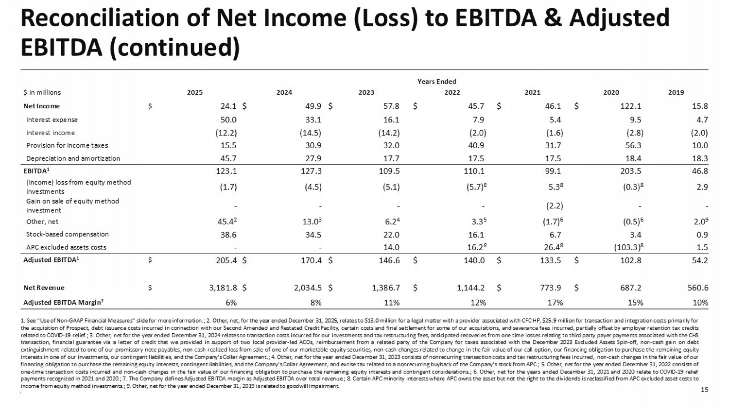 14 Reconciliation of Net Income (Loss) to EBITDA & Adjusted EBITDA Years Ended December 31, Three Months Ended December 31, 2024 2025 2024 2025 $ in thousands 49,932 $ 24,076 $ (7,777) $ 6,562 $ Net Income (loss) 33,097 49,928 8,069 17,520 Interest expense (14,508) (12,157) (3,221) (3,987) Interest income 30,886 15,530 5,882 944 Provision for income taxes 27,927 45,749 8,126 16,401 Depreciation and amortization 127,334 123,126 11,079 37,440 EBITDA (4,451) (1,708) (1,564) (1,176) Income from equity method investments 12,951 5 45,405 4 10,288 3 4,808 2 Other, net 34,536 38,601 15,235 11,382 Stock - based compensation 170,370 $ 205,424 $ 35,038 $ 52,454 $ Adjusted EBITDA 8% 6% 5% 6% Adjusted EBITDA margin 1 1. The Company defines Adjusted EBITDA margin as Adjusted EBITDA over total revenue.; 2. Other, net, for the three months end ed December 31, 2025 relates to $2.3 million for transaction and integration costs primarily for the acquisition of Prospect, ce rta in costs and final settlement for some of our acquisitions, and severance fees incurred, partially offset by employer retention tax credits rela ted to COVID - 19 relief.; 3. Other, net for the three months ended December 31, 2024 relates to transaction costs incurred for our i nvestments, to anticipated recoveries from one time losses relating to third party payer payments associated with the Collaborative Health S yst ems, LLC ("CHS") transaction, and non - cash change in the fair value of our call option.; 4. Other, net, for the year ended Decem ber 31, 2025, relates to $13.0 million for a legal matter with a provider associated with CFC HP, $25.9 million for transaction and integration costs pri marily for the acquisition of Prospect, debt issuance costs incurred in connection with our Second Amended and Restated Credi t F acility, certain costs and final settlement for some of our acquisitions, and severance fees incurred, partially offset by employer retention tax credit s r elated to COVID - 19 relief.; 5. Other, net for the year ended December 31, 2024 relates to transaction costs incurred for our inv estments and tax restructuring fees, anticipated recoveries from one - time losses relating to third party payor payments associated with the CHS t ransaction, a financial guarantee via a letter of credit that we provided in support of two local provider - led ACOs, non - cash ga in on debt extinguishment related to one of our promissory note payables, non - cash realized loss from the sale of one of our marketable equ ity securities, non - cash changes related to change in the fair value of our call option, non - cash change in the fair value of ou r financing obligation to purchase the remaining equity interests in one our investments, non - cash changes in the fair value of our contingent liabilities , non - cash changes in the fair value of the Company's Collar Agreement, and reimbursement from a related party of the Company fo r taxes associated with the Excluded Assets spin - off. AS1 AS2 KP3 KP4